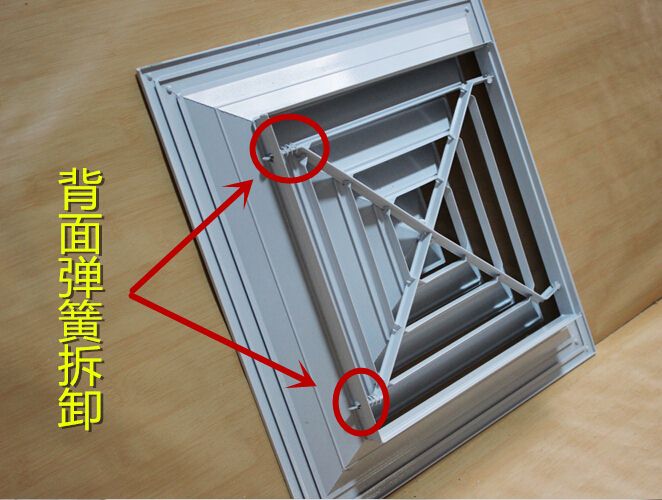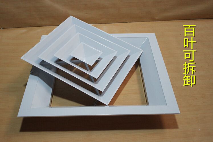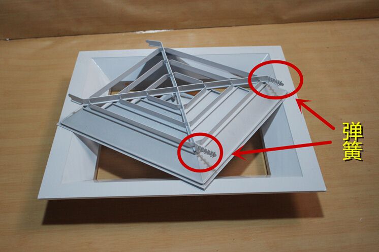 方型散流器使用該類型散流器時(shí)要與調(diào)節(jié)閥配合使用,才能在系統(tǒng)中得到理想的氣流分布。此風(fēng)口的葉片角度為固定式,不能隨意調(diào)節(jié),整個(gè)葉片與邊框采用分離結(jié)構(gòu)